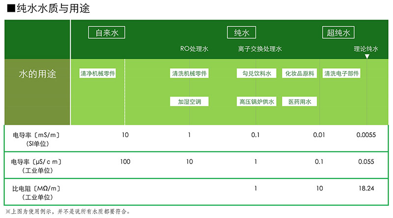 自然界的水和自來水中含有鈣等硬度成分、也含有鈉、硅(硅酸)等鹽類成分,這些成分對于用水水質要求嚴格的行業來說,有時會導致工業設備故障和產品不良。因此,工業企業通常使用將這些成分去除后的水(純水)。純水的水質一般用電導率來表示,電導率通常保持在0.05 ~ 1.0ms /m,(而自來水電導率通常保持在10 ~ 20ms /m)。電導率在國際單位制(SI)中是用ms/m來表示的,在傳統的工業單位中使用的是微米/厘米(μs/cm),換算過來就是1μs/cm=0.1ms/m。另外,高純度的純水采用的是難以導電的比電阻(工業單位: MΩ?cm)來表示水質。比電阻是用電導率(μS/cm)的倒數換算的。純水使用RO膜(反滲透膜)和離子交換樹脂來處理的。從處理的純度上來看,用離子交換樹脂處理的純度要比RO膜(反滲透膜)處理的更高,RO膜(反滲透膜)能夠制備導電率在0.5 ~ 1.0ms /m左右的純水,而離子交換樹脂能制備導電率在0.1 ~ 0.2mS/m左右的純水。